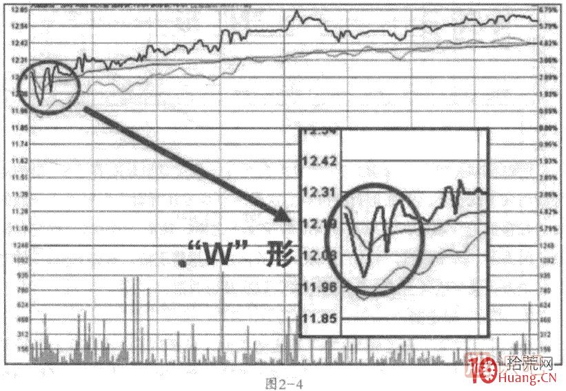 事實(shí)上,“W”形走勢與“N”形走勢類(lèi)似,只是多了一次探底而已,是二次探底的分時(shí)形態(tài),也就是在分時(shí)形態(tài)上形成一個(gè)“W”形走勢。如圖2-3和圖2-4.