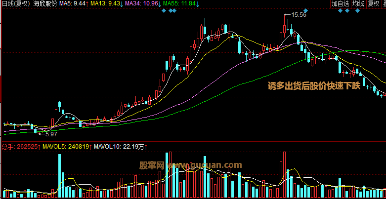 如果你在放巨量的第一天跟進(jìn),那第二天出場(chǎng)還存在著(zhù)一定的盈利機會(huì ),這就是前面提到過(guò)的超短線(xiàn)機會(huì ),但這似乎是在刀口舔血,因為此時(shí)主力手中的籌碼已經(jīng)所剩無(wú)幾,無(wú)力也無(wú)心再關(guān)心股價(jià)的走勢,他們唯一關(guān)心的是如何將手中的剩余籌碼輸送給散戶(hù),因此短線(xiàn)股價(jià)繼續拉升明顯就是為了出盡手中的剩余籌碼,這就注定是一個(gè)短命行情,隨后股價(jià)必將步入綿綿無(wú)終日的下跌,上圖已經(jīng)可以證明這點(diǎn),可見(jiàn)此時(shí)跟進(jìn)是一個(gè)非常不明智的行為,建議操作上盡量回避看來(lái)是正確的。