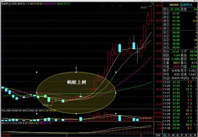 是指股價(jià)低位企穩,依托5日均線(xiàn),以連續小陽(yáng)線(xiàn)緩步攀升,其成交量保持在相對溫和的狀態(tài),會(huì )放出間歇量。特別是在盤(pán)勢回調時(shí)仍可保持同一節奏,就像螞蟻雄兵在不斷前進(jìn)一樣。但這時(shí)候不是最佳的買(mǎi)點(diǎn),而是在出現回調,下破5日線(xiàn),在10日線(xiàn)附近獲得支撐并收下影陰線(xiàn)的時(shí)候,考慮介入。因為隨后兩天往往會(huì )以陽(yáng)線(xiàn)向上攻擊,創(chuàng )出新高。
