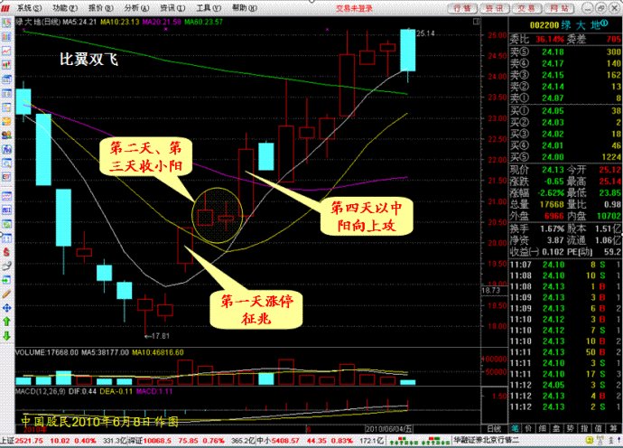 一只股票以漲停為前兆,第二天股價(jià)不補缺口卻收出小陽(yáng),第三天再度收出并排的一根小陽(yáng),則第四天或第五天往往會(huì )以中