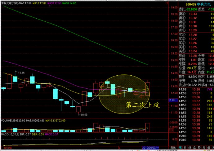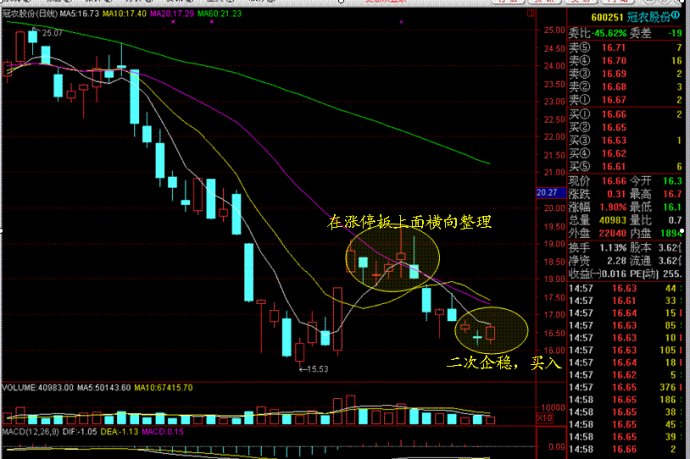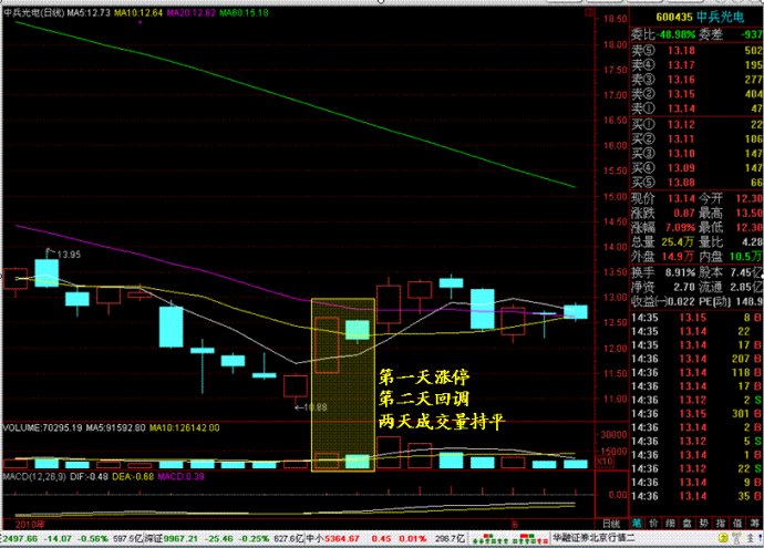 漲停之后,第二天略高開(kāi)2%-3%,受大盤(pán)影響長(cháng)陰回落至前一天漲停實(shí)體長(cháng)陽(yáng)中部,伴隨的成交量保持在5%以下,前后兩天基本持平。暗里是要上漲,卻是故意回撤。接下來(lái)通常有兩種走勢:一種是回靠5日線(xiàn)后收十字星,然后開(kāi)始反攻;另一種是開(kāi)盤(pán)略微下探,然后直接以陽(yáng)線(xiàn)吞吃前天的陰線(xiàn),創(chuàng )出新高。