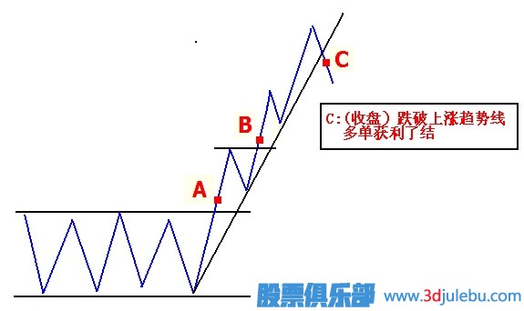 3、收盤(pán)跌破上漲趨勢線(xiàn),多單獲利了結。