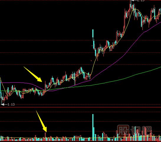 當出現上漲初期的放量沖高走勢時(shí),股價(jià)應已脫離底部區域,而且從底部區