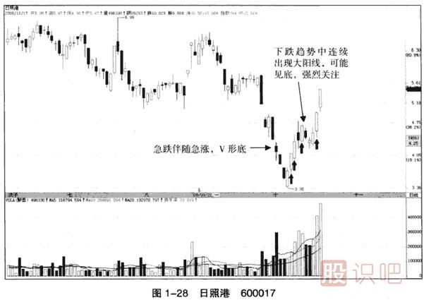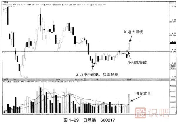 (6)如果加速看漲大陽(yáng)線(xiàn)出現在下跌趨勢中,應密切關(guān)注,準備迎接底部的到來(lái)。