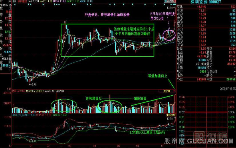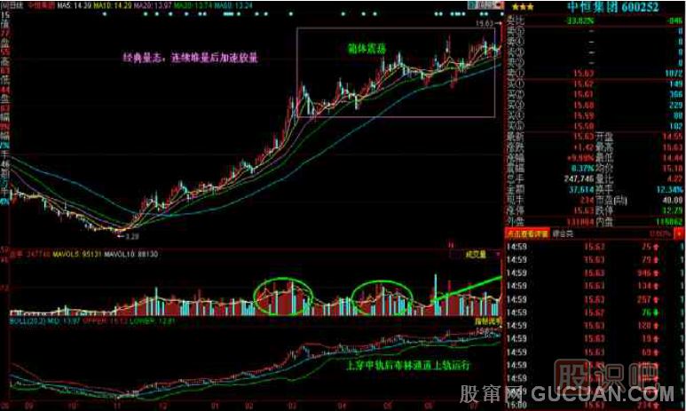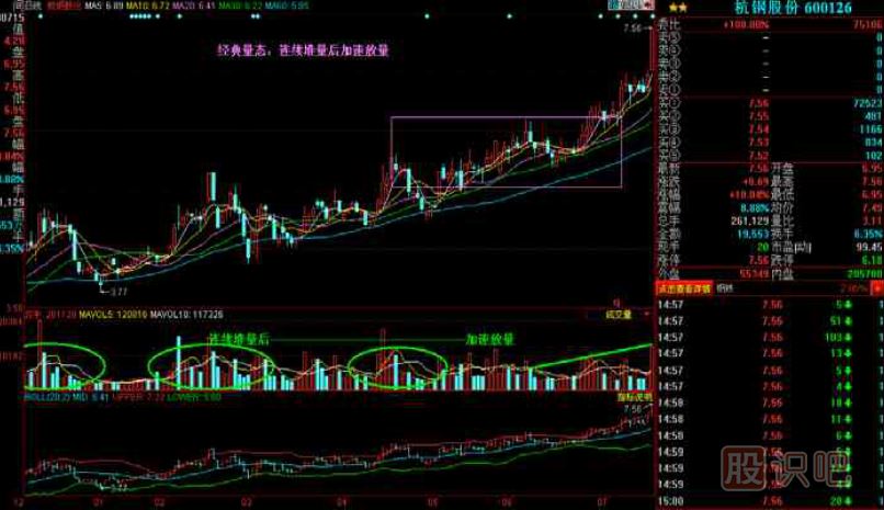 技術(shù)特征:長(cháng)江后浪推前浪一連續堆量后加速放量的經(jīng)典量態(tài):前期股價(jià)箱體震蕩,成交量呈階段性堆量,堆量的末端,成交量連續放量,推動(dòng)股價(jià)節節走高。階段性堆量過(guò)程就大海遠遠的一波一波的浪的波動(dòng);連續放量,就像己推行到岸邊巖石上的前浪,加速磅礴向上。前期階段性的堆量過(guò)程,是主力機構有計劃、有意識做盤(pán)留下的痕跡,它一般是中長(cháng)線(xiàn)主力的試探性建倉行為,也可能是短線(xiàn)主力搜集籌碼的所致,這時(shí)對應K線(xiàn)多呈箱體震蕩形態(tài);一旦建倉完畢,隨后加速放量,推動(dòng)股價(jià)爆發(fā)一波上升浪。