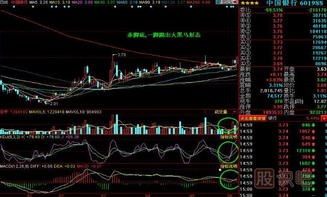 2.足底部運行時(shí),日線(xiàn)、周線(xiàn)的中期擺動(dòng)指標MACD、RSI、KDJ往往形成一底比一底高的底背離態(tài)勢,揭示下跌力道的衰竭。