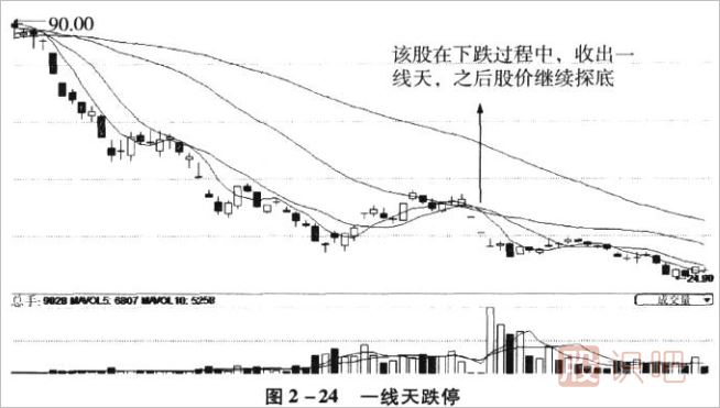 如果一線(xiàn)天為跌停,且出現在下跌過(guò)程中,則要非常謹慎,后市可能繼續連續一線(xiàn)天跌停,投資者不可急于買(mǎi)入,如圖2-24所示。