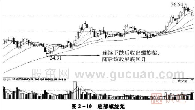 當股價(jià)經(jīng)過(guò)一段時(shí)間的下跌之后,出現螺旋槳K線(xiàn),意味著(zhù)股價(jià)很可能即將見(jiàn)底,這是一個(gè)看漲的信號,投資者遇到這樣的K線(xiàn)可以適當買(mǎi)入,待漲勢形成,就可以繼續追加投入。如圖2-10所示