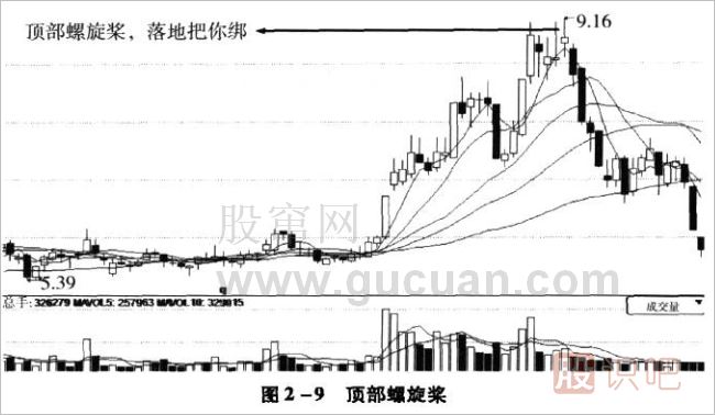 正因為螺旋槳體現出多空雙方的爭奪,表明市場(chǎng)不傾向于某一方,一旦這樣的K線(xiàn)出現,往往預示著(zhù)盤(pán)面即將發(fā)生變化。如果市場(chǎng)一直處于多頭行情之中,螺旋槳出現后很可能會(huì )變盤(pán),使得股價(jià)由漲轉跌,因此就有“頂部螺旋槳,落地把你綁”的說(shuō)法。如圖2-9所示。