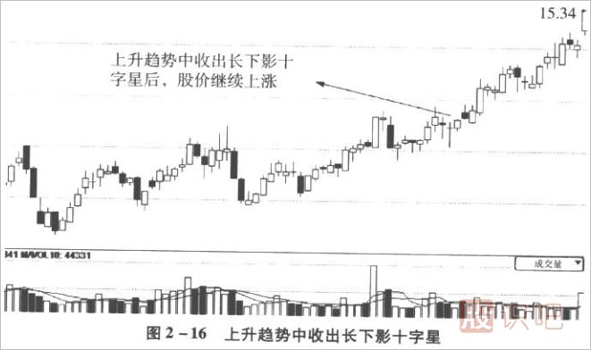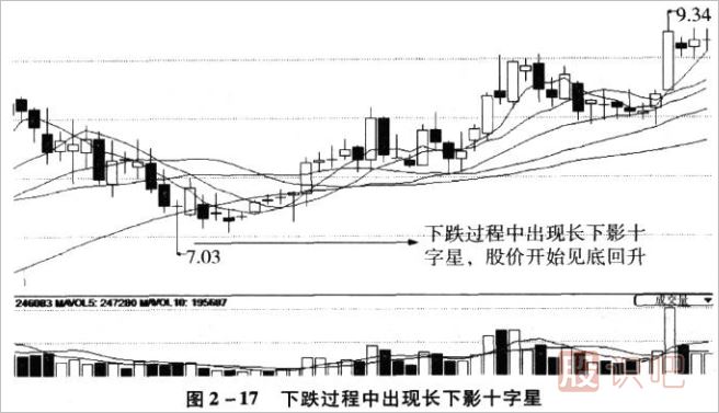 長(cháng)下影十字星如果出現在上升趨勢形成初期,一般表示暫時(shí)休整,上升趨勢未改,空方雖然進(jìn)行了一次反攻,但最后股價(jià)仍然收了回去如圖2-16所示;如果是出現在持續下跌之后的低價(jià)區,則暗示賣(mài)盤(pán)減弱,買(mǎi)盤(pán)增強,股價(jià)轉向上升的可能性在增大,如圖2-17所示