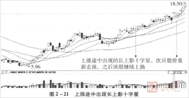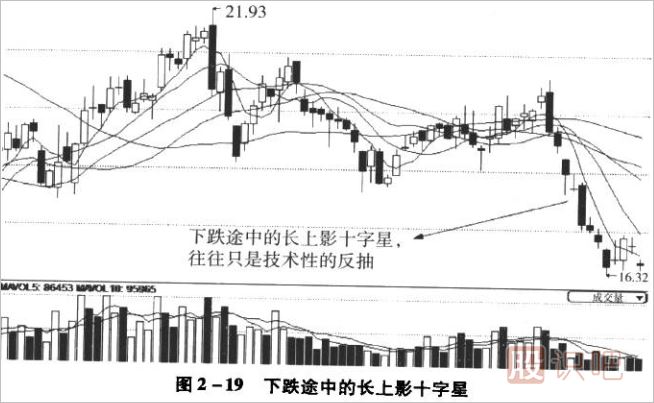 長(cháng)上影十字星如果出現在下降趨勢中途,一般表示暫時(shí)休整,下降趨勢未改,這樣的K線(xiàn)一般是主力盤(pán)中向上拉升,以讓散戶(hù)誤以為多頭猛攻,結果抄底被套,而這些被套的投資者短線(xiàn)賣(mài)出就會(huì )形成新的“多殺多”,進(jìn)而使得股價(jià)繼續下跌,如同2-19所示