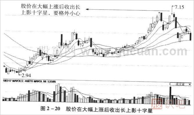 如果長(cháng)上影的十字星出現在已經(jīng)持續大幅上漲之后的高價(jià)區,股價(jià)轉向下跌的可能性較大,沖高回落的K線(xiàn)表明多方上攻乏力,遇到這樣的K線(xiàn)應該先行賣(mài)出,如圖2-20所示。