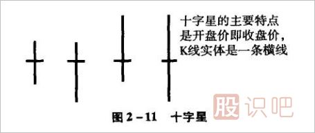 十字星K線(xiàn)與螺旋槳有一個(gè)共同點(diǎn),就是K線(xiàn)上下方都有長(cháng)影線(xiàn),其區別在于:螺旋槳的上下影很長(cháng),K線(xiàn)實(shí)體很??;十字星的實(shí)體則只是一條橫線(xiàn),上下影可長(cháng)可短,K線(xiàn)實(shí)體與上下影構成了一個(gè)“十字架”的圖形,因而得名“十字星”。如圖2-11所示