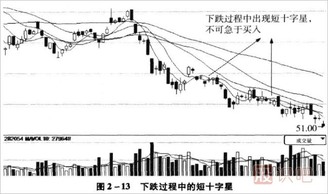 如果十字星上下影較短,則表明雙方都比較謹慎。如果股價(jià)處于上升趨勢,那么這樣的K線(xiàn)只能當成是上升過(guò)程中的主力洗盤(pán),股價(jià)還會(huì )繼續上揚,投資者應以持有為主,如圖2-12;如果股價(jià)處于下降趨勢中,這樣的K線(xiàn)則只能當成是“下跌中繼”,股價(jià)回抽之后還會(huì )繼續下跌,投資者宜加以觀(guān)望。如圖2-13所示。