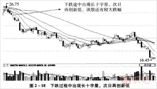 如果次日股價(jià)再次下跌并創(chuàng )新低,則預示著(zhù)后市或許還有較大的跌幅,這樣的十字星被稱(chēng)為“下跌工兵”,長(cháng)下影的十字星為空方試探下方區域的支撐,再次下跌是對下降趨勢的確認,這樣的股票不能盲目買(mǎi)入,如同2-18所示。
