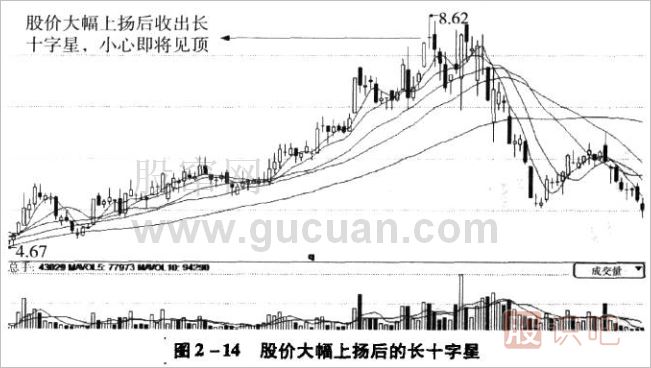 長(cháng)十字星如果出現在股價(jià)上升一段時(shí)間之后,那么該股股價(jià)很可能即將見(jiàn)頂,由升轉跌。如圖2-14所示,這只股票在經(jīng)過(guò)大幅上揚之后,日k線(xiàn)收出一根長(cháng)十字星,股價(jià)短暫停頓后繼續又上漲了一段,這時(shí)多方已經(jīng)有些力不從心,而之前的十字星表明空方已進(jìn)行了一次強力打擊,此時(shí)投資者應該減倉,隨后該股見(jiàn)頂,股價(jià)由漲轉跌,如果能夠在出現長(cháng)十字星時(shí)采取謹慎的操作手段,就能回避后面的下跌。