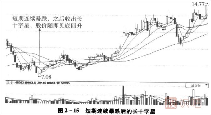 相反,長(cháng)十字星如果出現在股價(jià)下跌一段時(shí)間之后,那么股價(jià)也很可能即將見(jiàn)底,由跌轉升。我們來(lái)看圖2-15所示的股票,這只股票出現了罕見(jiàn)的短期連續大跌,調整較為充分,當K線(xiàn)收出長(cháng)十字星時(shí),顯示空方殺跌力量已有不足,多頭開(kāi)始嘗試反攻。此時(shí),激進(jìn)的投資者就可以“買(mǎi)跌”,隨后該股便探明了底部,開(kāi)始一路上揚??梢?jiàn),長(cháng)十字星出現在連續下跌后是明顯的見(jiàn)底信號。