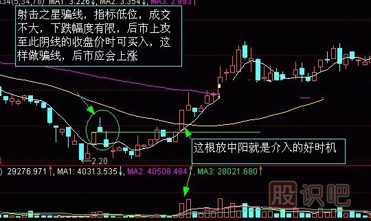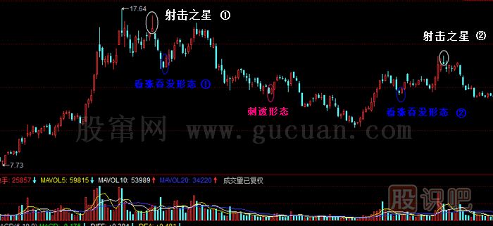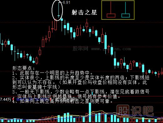 5.理想狀態(tài)是射擊之星(流星線(xiàn))次日是向下跳空的長(cháng)長(cháng)的陰線(xiàn)與射擊之星的實(shí)體有缺口,缺口越大越有利。