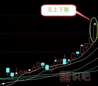 4.無(wú)上下影線(xiàn),長(cháng)紅線(xiàn)(太陽(yáng)線(xiàn)),一路漲到底,買(mǎi)方力道強,如圖: