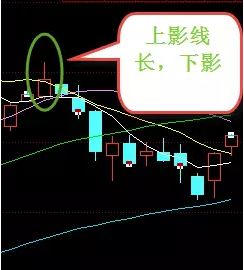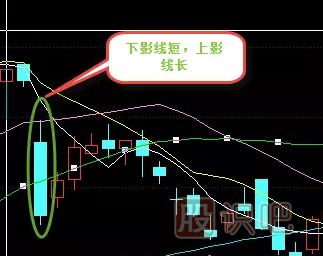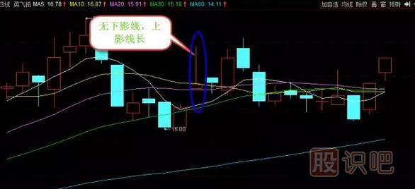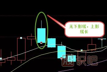 1.無(wú)下影線(xiàn),上影線(xiàn)長(cháng),表示先漲后跌,反彈無(wú)力,空頭氣勢強勁,如圖: