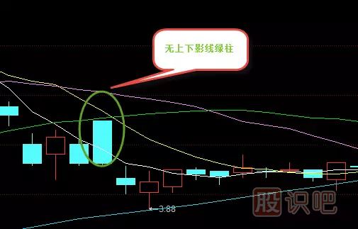 5.上下影線(xiàn)短,實(shí)體綠柱長(cháng),一般是跌勢時(shí)出現,表示下跌力道仍強,大跌后出現,為反轉試探,表后市可能急速下跌,如圖: