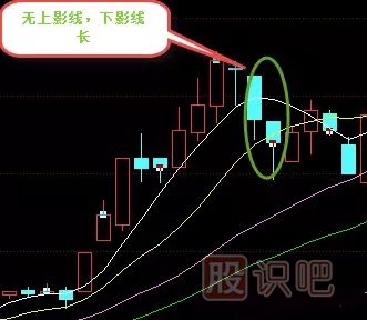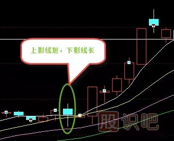 4.上影線(xiàn)短,下影線(xiàn)長(cháng),表示表示多空交戰,空頭略勝一籌,但下跌時(shí)遇強勁支撐力,如圖: