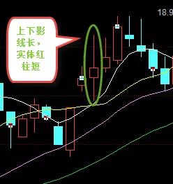 7.上下影線(xiàn)長(cháng),實(shí)體紅柱短,表示多空交戰力道接近,行情撲朔不明,如圖:
