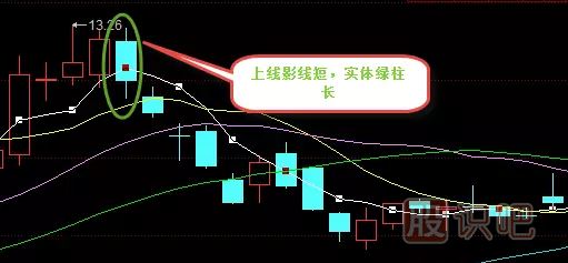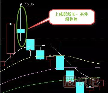 6.上下影線(xiàn)長(cháng),實(shí)體綠柱短,表示多空交戰力道接近,行情撲朔不明,如圖:
