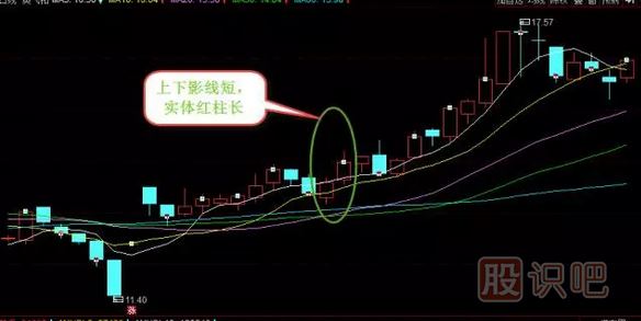 3.上線(xiàn)影線(xiàn)短,實(shí)體紅柱長(cháng),表示漲勢強,股價(jià)盤(pán)堅,如圖: