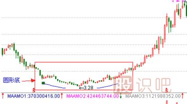 如上圖紅色矩形內所示,所謂圓形底就是指底部是個(gè)圓弧形的,像個(gè)碗底一樣,我們可以清晰地看到,圓形底是有很多振幅和實(shí)體都很小的K線(xiàn)組成。從上圖看,左側K線(xiàn)由大變小,說(shuō)明做空力量衰竭殆盡,右側K線(xiàn)由小變大,說(shuō)明多方力量緩慢增強,圓形底出現的概率非常高,這符合事物發(fā)展的規律,大多數情況下底部的形成是一個(gè)有序漸進(jìn)的過(guò)程,實(shí)戰中V形底這種突變反轉并不常見(jiàn),多數個(gè)股底部通常會(huì )是圓形底。