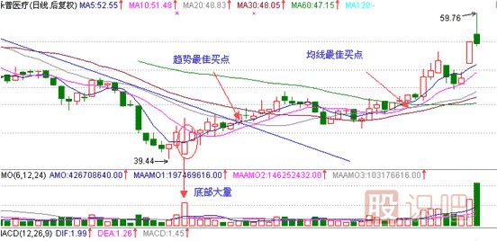 樂(lè )普醫療(300003)在2009年10月上市后股價(jià)處于長(cháng)期整頓期。從上圖看地量結構明顯,但2010年2月日出現了底部大量的仙人指路K線(xiàn)形態(tài),兩天前還有一個(gè)金針探底出現。我們約莫估計這就是底部區域,當然穩健的投資者還是等箭頭一趨勢最佳買(mǎi)點(diǎn)和箭頭二均線(xiàn)最佳買(mǎi)點(diǎn)出現后再入場(chǎng)比較妥當。