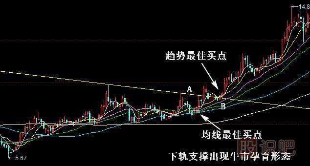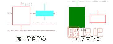 牛市孕育形態(tài)中,由于右面的小陽(yáng)K線(xiàn)吞噬了左面陰線(xiàn)實(shí)體的中腹部分,對做空力量是一種毀滅性的瓦解。我看很像在空方體內放置了一枚********。只要第三天股價(jià)K線(xiàn)實(shí)體重心上移、量能放大,就很容易引起趨勢的逆轉,從而底部成立。在技術(shù)形態(tài)上,這里要求右面的陽(yáng)線(xiàn)實(shí)體必須全部位于左面陰線(xiàn)實(shí)體內部,而且必須腐蝕陰線(xiàn)實(shí)體中部上下的位置,只在中部二分之一以下的不能算作牛市孕育形態(tài)。這里需要解釋一下,很多K線(xiàn)專(zhuān)家包括日本的技術(shù)分析師認為只要小陽(yáng)線(xiàn)位于陰線(xiàn)實(shí)體內部即可。但我多年的實(shí)戰發(fā)現,如果陽(yáng)線(xiàn)不能腐蝕陰線(xiàn)實(shí)體腹部區域,其反轉的力度很小,很多時(shí)候會(huì )是下跌中繼形態(tài),這里恕我狂妄,為大家負責起見(jiàn),希望大家以我說(shuō)的為技術(shù)平判標準。