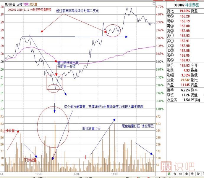 技術(shù)分析不是那么簡(jiǎn)單,不是讀讀波浪理論、搞搞江恩理論,然后再弄幾個(gè)技術(shù)指標就算技術(shù)高手了,能在第一時(shí)間對股價(jià)走勢進(jìn)行精準打擊,就必須對分時(shí)的量能結構和具體的微細的盤(pán)口細節具備相當的認知和解讀能力,下面是我今日(2010.3.11)實(shí)盤(pán)講解時(shí)對300002分時(shí)盤(pán)口的解讀,這是如何在第一時(shí)間對買(mǎi)點(diǎn)進(jìn)行精準撲捉的實(shí)盤(pán)運用,希望大家都好好看看,很多東西會(huì )在以后操盤(pán)中會(huì )周而復始的出現,我們來(lái)看下面這幅圖: