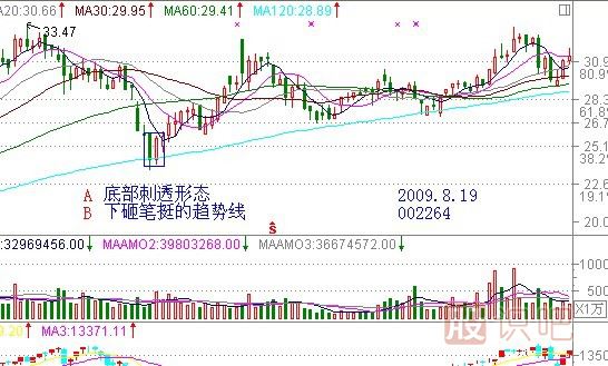 刺透形態(tài),又稱(chēng)斬回線(xiàn)形態(tài)、旭日烘底、刨根問(wèn)底,叫法挺多,本來(lái)想用刨根問(wèn)底來(lái)命名,后來(lái)想想炒股是一門(mén)嚴謹的科學(xué),和趙本山的小品不能混為一談,我們還是用個(gè)嚴肅的名字。