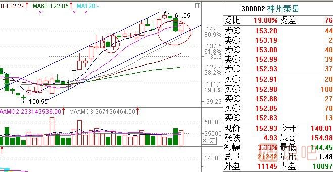 對刺透形態(tài)的運用不僅限于長(cháng)期底部,而且適用于股價(jià)的調整階段,在底部形態(tài)(一)啟明星篇中說(shuō)過(guò)300002神州太岳,那時(shí)股價(jià)近160元,建議大家調整到140元左右進(jìn)行低吸,今天機會(huì )就來(lái)了。
