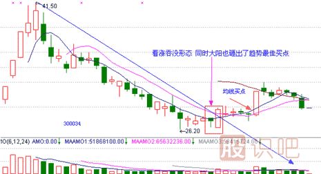 均線(xiàn):吞沒(méi)形態(tài)出現后,均線(xiàn)系統配合出現金叉或者死叉,效果也能夠得到更好的確認。