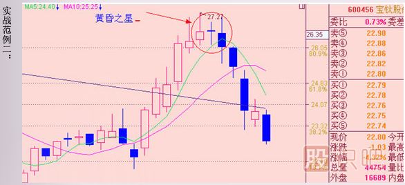 600456,寶鈦股份,近幾日走勢圖,大家看在黃昏之星頭部形態(tài)出現的同時(shí)攻擊線(xiàn)拐頭向下,此時(shí)短線(xiàn)投資者應作減倉處理,隨后股票出現了較大跌幅,上周五操盤(pán)線(xiàn)拐頭已經(jīng)向下,此時(shí)應作再次減倉或出局處理。