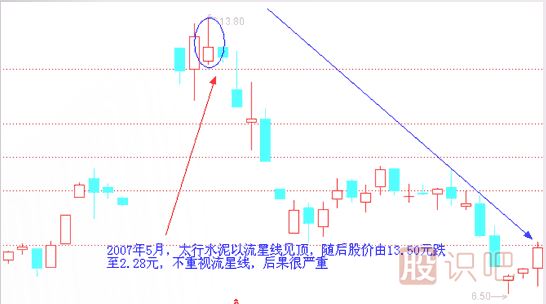 實(shí)戰范例四:5月,太行水泥以流星線(xiàn)形態(tài)見(jiàn)頂,隨后股價(jià)開(kāi)始了熊途之旅,從13.50元跌至2.28元,可謂不識流星線(xiàn),后果很?chē)乐兀?br />