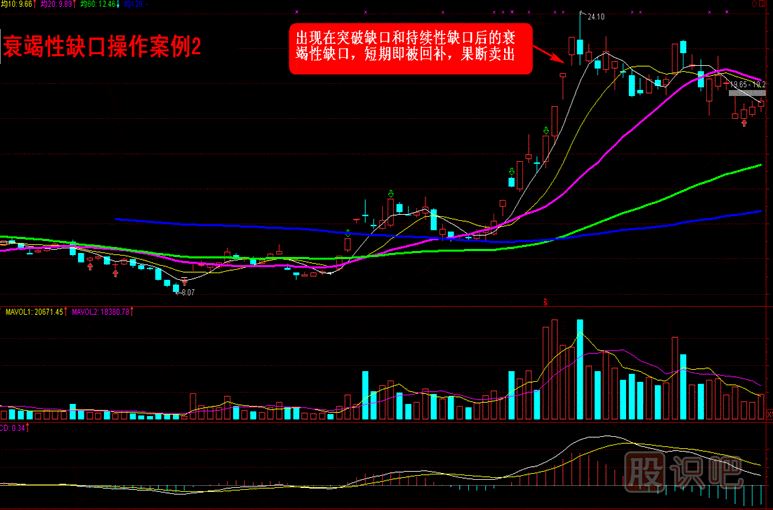 衰竭性缺口又稱(chēng)消耗性缺口,一般發(fā)生在突破缺口行情趨勢的末端,表明股價(jià)劇烈變動(dòng)的結束。在出現突破缺口和持續性缺口之后所出現的缺口往往是衰竭性缺口。它與持續性缺口的不同之處在于:衰竭性缺口的成交量會(huì )急劇放大,且往往會(huì )在短期內被回補,當缺口回補時(shí),衰竭性缺口即宣告成立,則該輪缺口急速上漲行情也宣告結束。