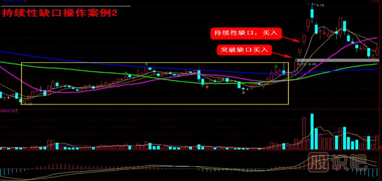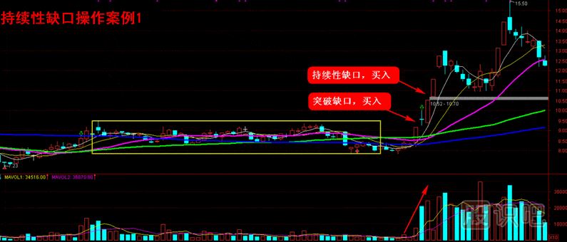 就持續性缺口的操作而言,投資者可以在出現持續性缺口后做出買(mǎi)入或者賣(mài)出決策,當方向向上時(shí)買(mǎi)入,此時(shí)同樣需要成交量的放大來(lái)對價(jià)格進(jìn)行驗證(漲停板模式除外);反之,方向向下時(shí)賣(mài)出。