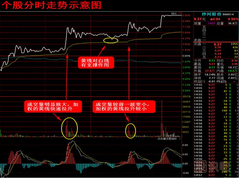 個(gè)股的分時(shí)走勢圖中的黃白線(xiàn),白線(xiàn)代表股價(jià)當天的即時(shí)價(jià)格線(xiàn),黃線(xiàn)代表的是含成交量的加權平均價(jià)格線(xiàn),代表當天買(mǎi)進(jìn)的投資者的平均持倉成本。在白線(xiàn)同等的漲幅時(shí),若分時(shí)走勢中成交量明顯放量,則黃線(xiàn)拉升較快,若成交量沒(méi)有放量或者放量較小,則黃線(xiàn)拉升較慢。黃線(xiàn)對白線(xiàn)有較強的支撐和壓制作用,當白線(xiàn)在黃線(xiàn)上方時(shí)表現為支撐作用,當白線(xiàn)在黃線(xiàn)下方時(shí)表現為壓制作用。