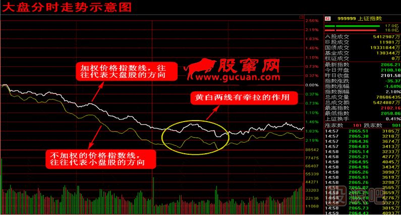 大盤(pán)分時(shí)走勢圖中的黃白線(xiàn),白線(xiàn)是代表加權的即時(shí)指數線(xiàn),是交易所編制和發(fā)布的,往往代表大盤(pán)股的走勢;黃線(xiàn)則代表不加權的即時(shí)指數線(xiàn),是各個(gè)軟件公司自行編制的,往往代表大多數小盤(pán)股的走勢。當大盤(pán)上漲時(shí):如果白線(xiàn)在上方,則說(shuō)明大盤(pán)的上漲主要是由大盤(pán)股帶動(dòng)的;如果黃線(xiàn)在上方,則說(shuō)明大盤(pán)的上漲主要