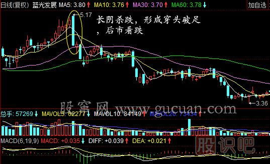 實(shí)例1:2009年11月,藍光發(fā)展(600466)還在穩步上升階段,11月23日收出一根溫和量能的陽(yáng)線(xiàn),第二天股價(jià)順勢高開(kāi),很多興奮的投資者便迫不及待地追高買(mǎi)入,但買(mǎi)家剛沒(méi)興奮多久,股價(jià)便急轉直下,由升轉跌,大幅殺跌至當時(shí)收盤(pán),K線(xiàn)形態(tài)上形成了穿頭破足的走勢。24日的大陰線(xiàn)將23日陽(yáng)線(xiàn)的最高價(jià)和最低價(jià)全部包含,即比前一天最高價(jià)還高的價(jià)格開(kāi)盤(pán),比前一天最低價(jià)還低的價(jià)格收盤(pán)。此后,股價(jià)便開(kāi)始了連續的調整,如圖所示。