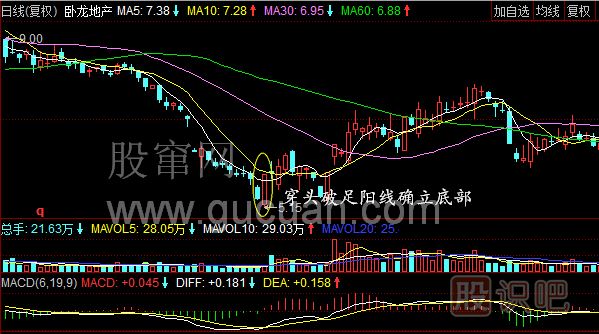 實(shí)例2:2010年5月5日,臥龍地產(chǎn)(600173)在經(jīng)過(guò)很長(cháng)一段時(shí)間的連續下跌之后,順勢低開(kāi),此時(shí)很多投資者由于內心的恐懼,在低位選擇割肉賣(mài)出。但就在當日低開(kāi)反復震蕩后,上午收盤(pán)前該股卻迅速大幅拉升,在K線(xiàn)形態(tài)上形成了穿頭破足陽(yáng)線(xiàn),將前一天的陰線(xiàn)全部吞掉,這顯示多頭力量非常強勁,隨后,該股確立了底部,穩步震蕩上行,如圖所示。