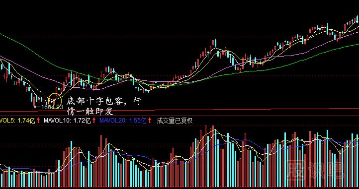 但指數自跌到1664點(diǎn)以后,卻不再繼續單邊下跌,而是展開(kāi)了橫向的弱勢整理。2008年11月6日收出了一根縮量的十字星,次日即11月7日上證綜指大幅低開(kāi),投資者恐慌到了極點(diǎn),紛紛拋售。但當日指數低開(kāi)高走,收出了一根大陽(yáng)線(xiàn),與前一個(gè)十字星形成了一組穿頭破足陽(yáng)線(xiàn)的走勢,這是明確的見(jiàn)底信號,很多激進(jìn)的投資者在此點(diǎn)位選擇入場(chǎng),之后上證指數一路上揚,走出了翻番的走勢,如圖所示。