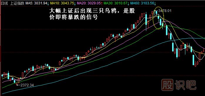 2.三只烏鴉出現在股價(jià)大幅上漲后是股價(jià)即將暴跌的信號,投資者要特別小心。三只烏鴉后兩根陰線(xiàn)如果高開(kāi)低走,股價(jià)看跌信號更明確。