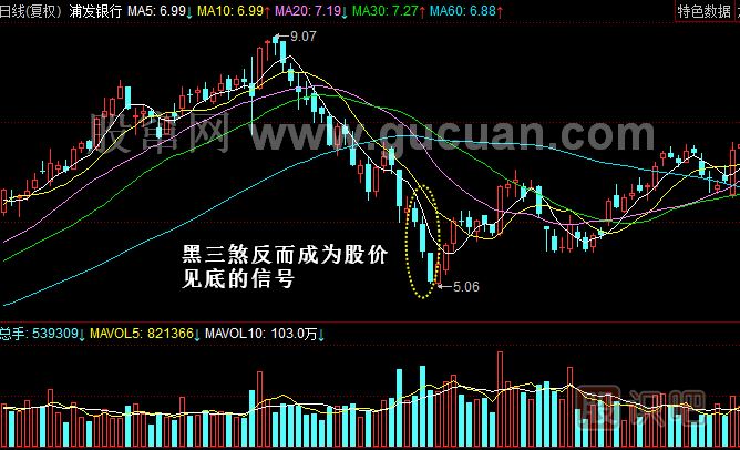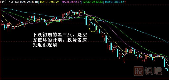 前一節講的紅三兵,有紅三兵就有黑三兵。當三只烏鴉的K線(xiàn)實(shí)體較小時(shí),就如同三個(gè)身穿黑色衣服的小兵,也是下跌的信號,但預示的強度不如三只烏鴉,如果出現在高位,投資者可先退出觀(guān)望,經(jīng)過(guò)短期調整之后,再作新的投資決定。