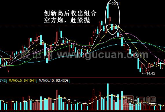 同時(shí)空方炮也會(huì )出現變異,有時(shí),在收出空方炮之后股價(jià)并未直接下跌,而是又上漲了一天,之后再收出陰線(xiàn)。此時(shí)走出的“三陰夾兩陽(yáng)”的K線(xiàn)組合就稱(chēng)為組合空方炮,組合空方炮將多頭的頑強抵抗摧毀,也是強烈的看跌信號,投資者應及時(shí)賣(mài)出。
