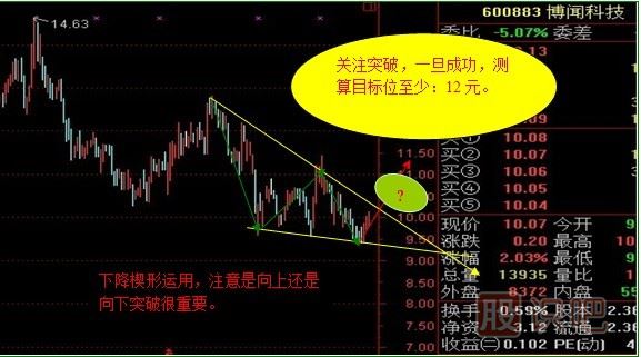 楔形是一種持續形態(tài),適用于中線(xiàn)分析,通常拖延至三至六個(gè)月時(shí)間,短線(xiàn)分析意義不大,而且容易被騙。上周在盤(pán)中給大家提示的下降楔形最后被騙就是這個(gè)道理。向大家道歉了,接下來(lái)我會(huì )更加謹慎和努力為大家服務(wù)好。