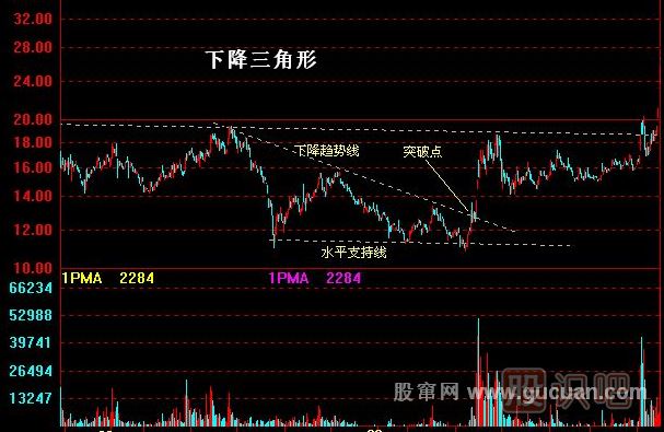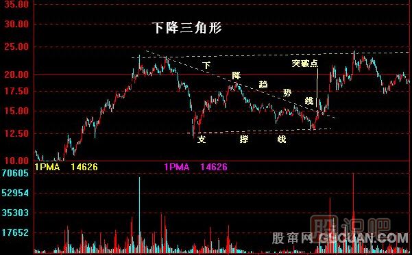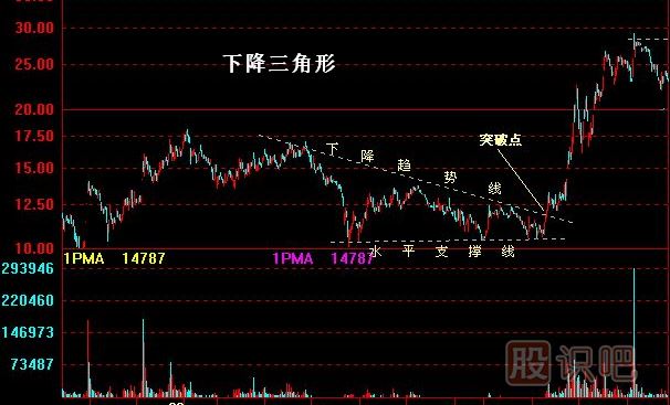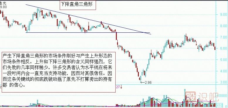 下降三角形的形狀的上升三角形恰好相反,股價(jià)在某特定的水平出現穩定的購買(mǎi)力,因此介每回落至該水平便告回升,形成一條水平的需求線(xiàn)??墒鞘袌?chǎng)的沽售力量卻不斷加強,股價(jià)每一次波動(dòng)的高點(diǎn)都較前次為低,于是形成一條下傾斜的供給線(xiàn)。成交量在完成整個(gè)型態(tài)的過(guò)程中,一直是十分低沉。